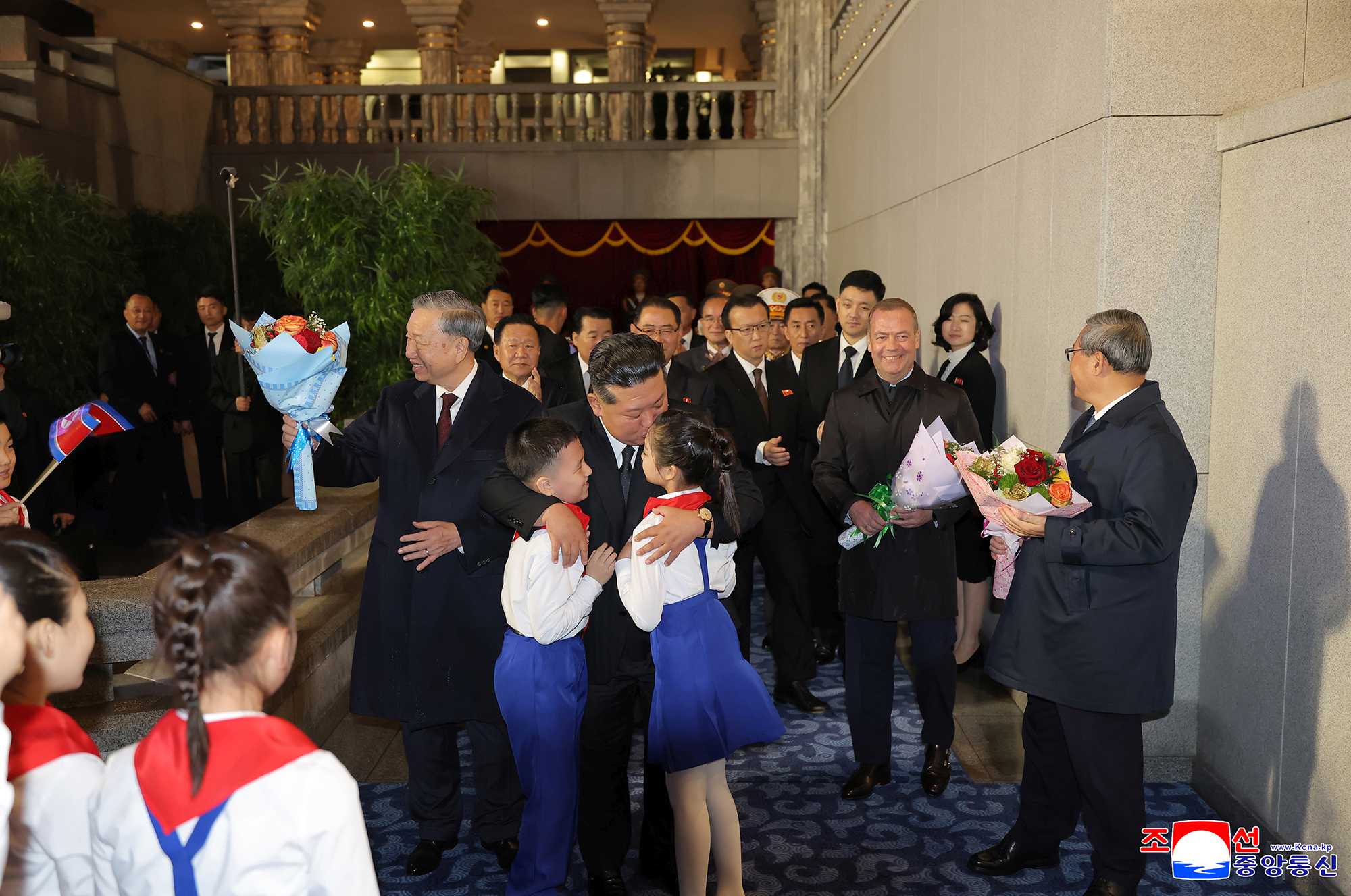 Kim Jong Un and party and government leaders of different countries received fragrant bouquets from children’s union members.