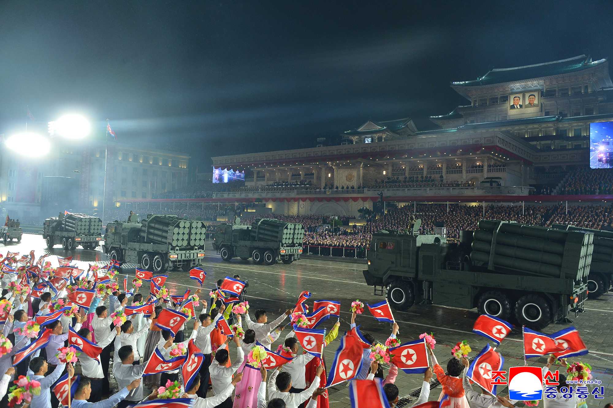 When the core offensive weapon systems of new generation capable of delivering precision strikes at enemy’s major targets and the column of 600mm MLRSs, the unique ultra-modern weapon of Juche Korea in the world, entered the square, the audience warmly welcomed them with enthusiastic cheers and handclaps.