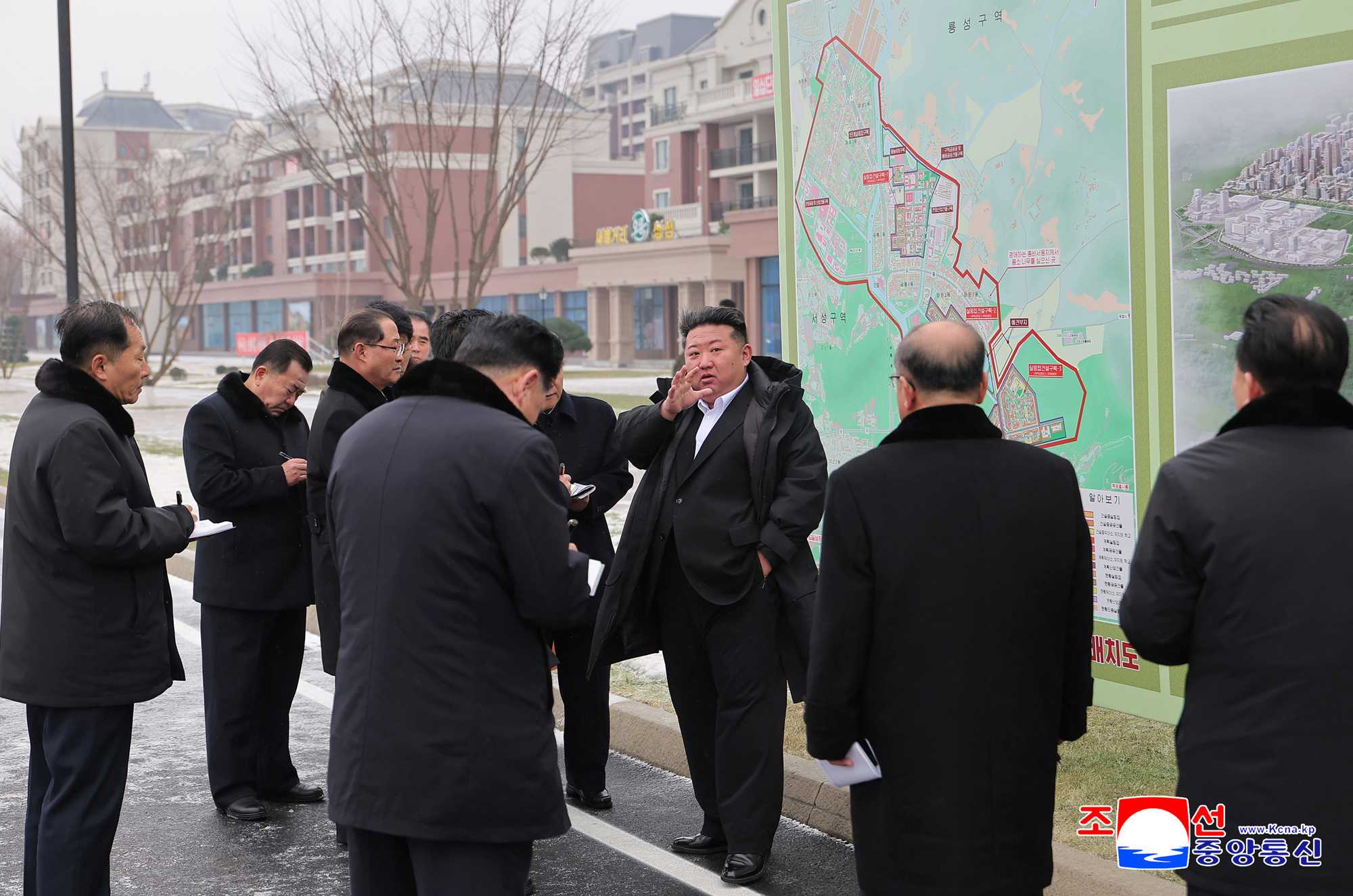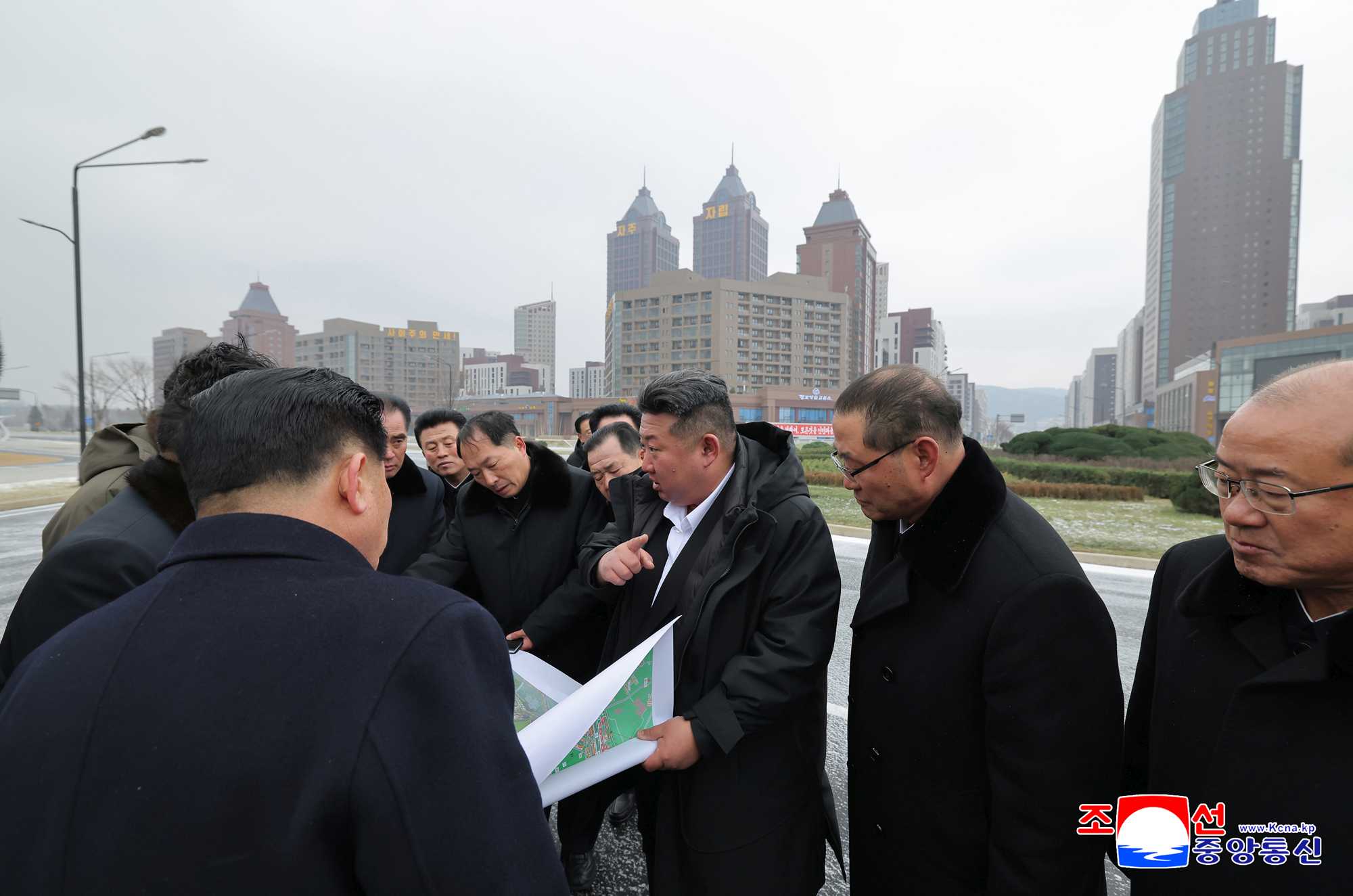 Kim Jong Un first looked at the layout of buildings and a general bird’s-eye view of housing construction area in Hwasong to learn in detail about the construction project.