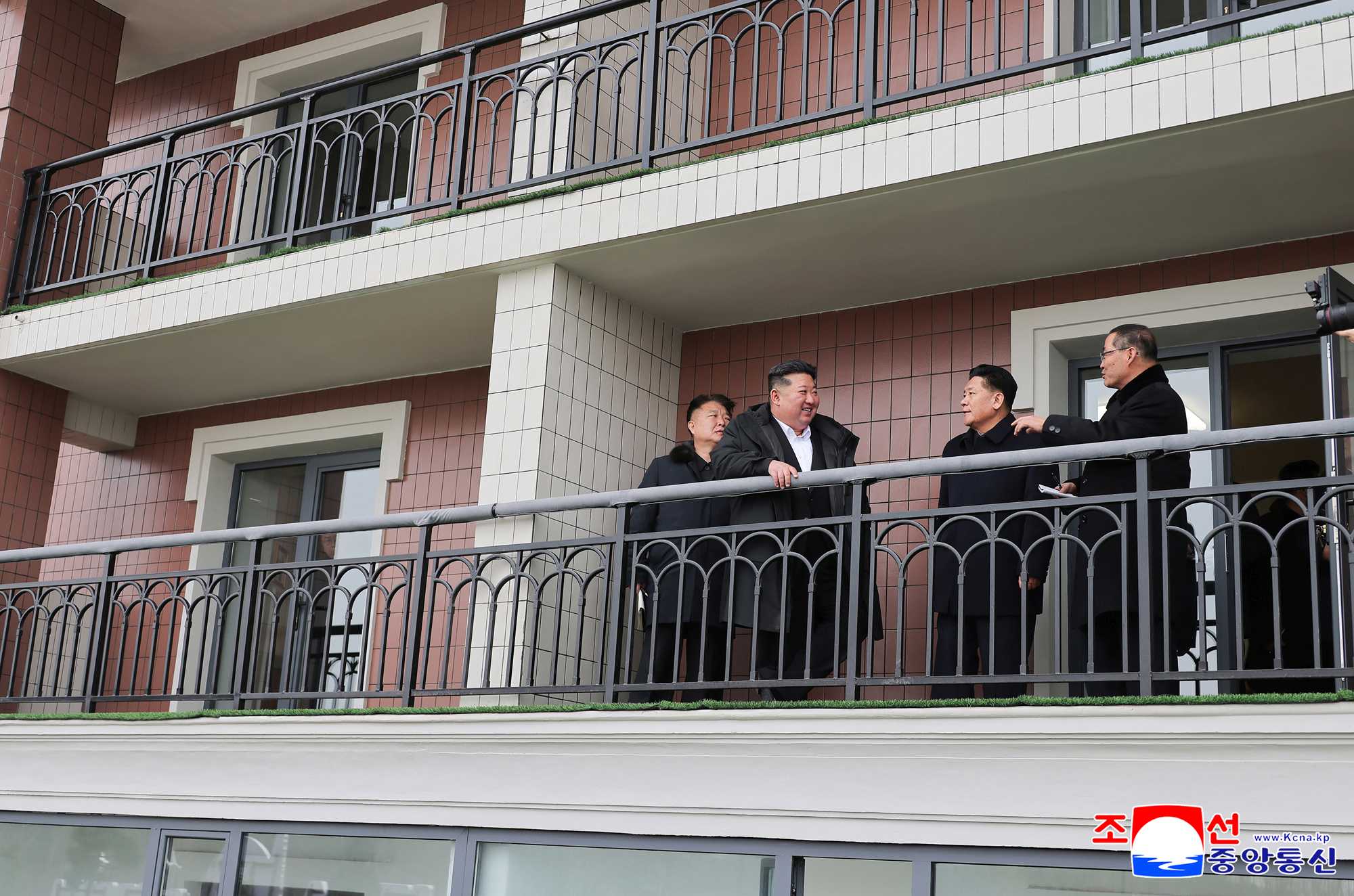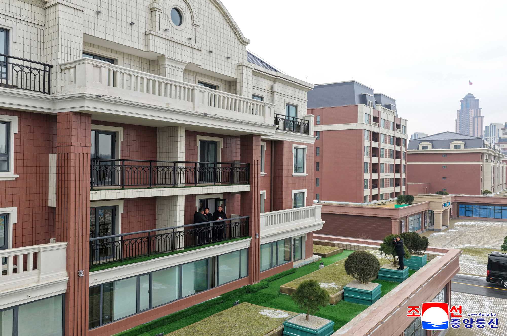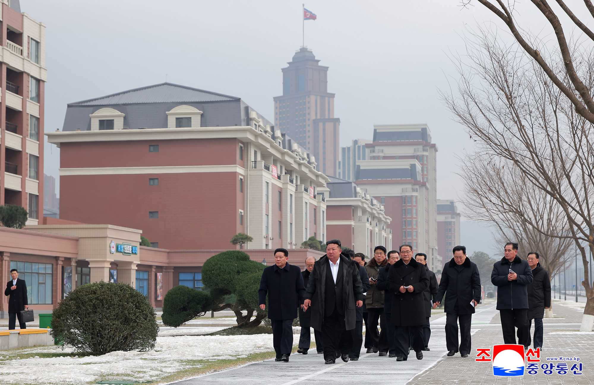 He was greeted on the spot by Vice-premier Kim Jong Gwan and officials of the headquarters for building 50 000 flats in Pyongyang and design organs.