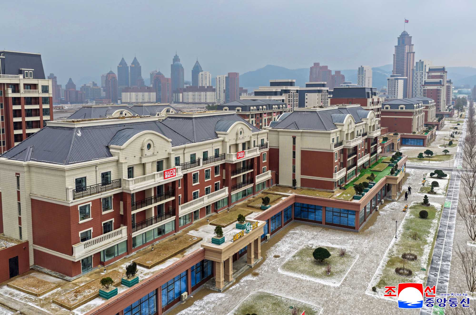 At his direct initiative and under his guidance, another architectural group, in which high-rise, medium- and low-storeyed apartment houses, commercial and service facilities and other public buildings are in ideal harmony, is presenting a spectacular sight in the Hwasong area, apart from the construction plan for 10 000 flats at the fourth stage.