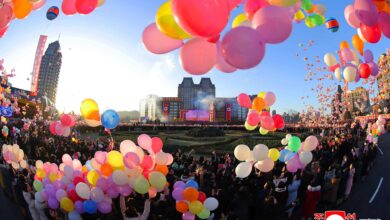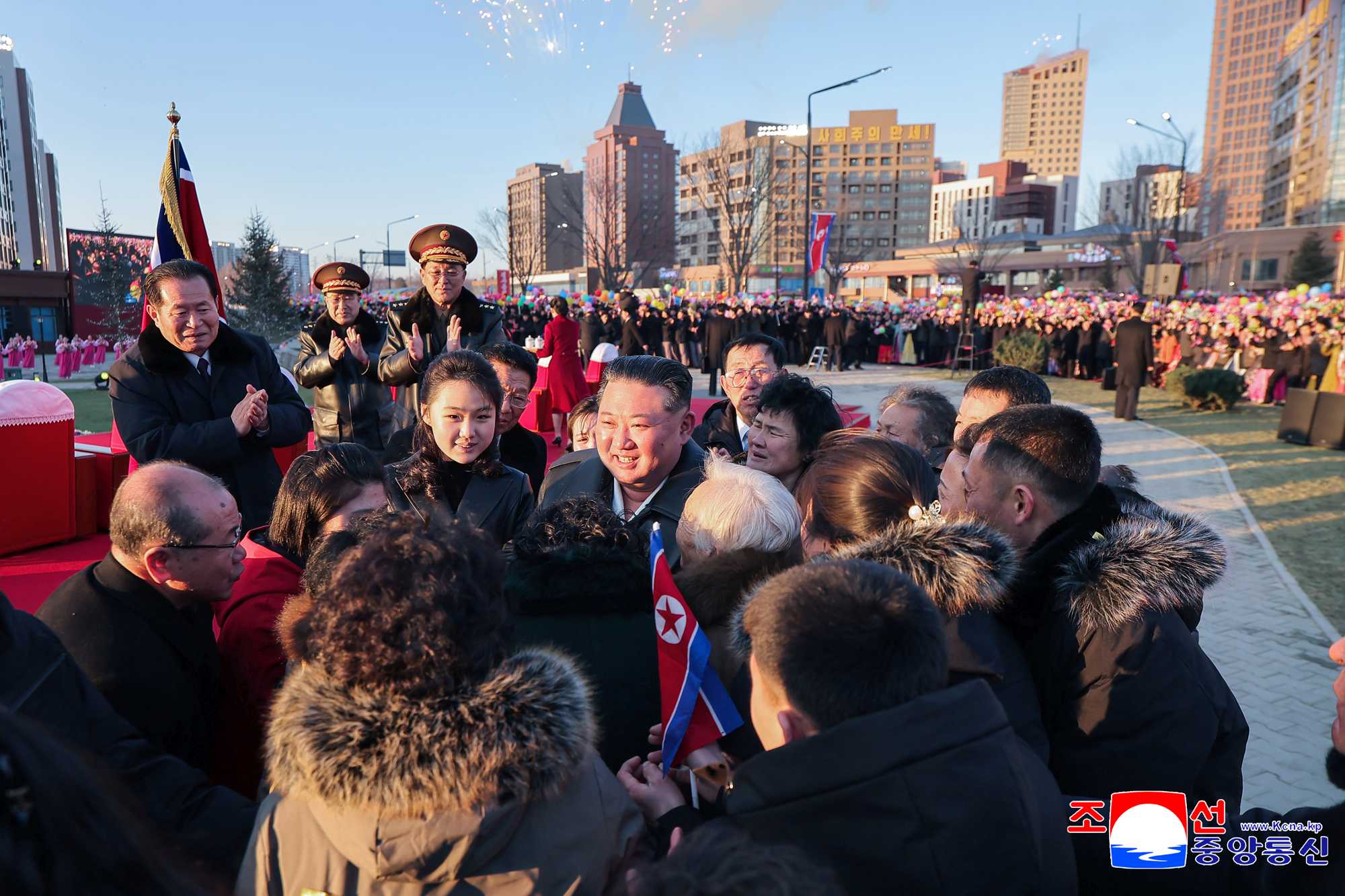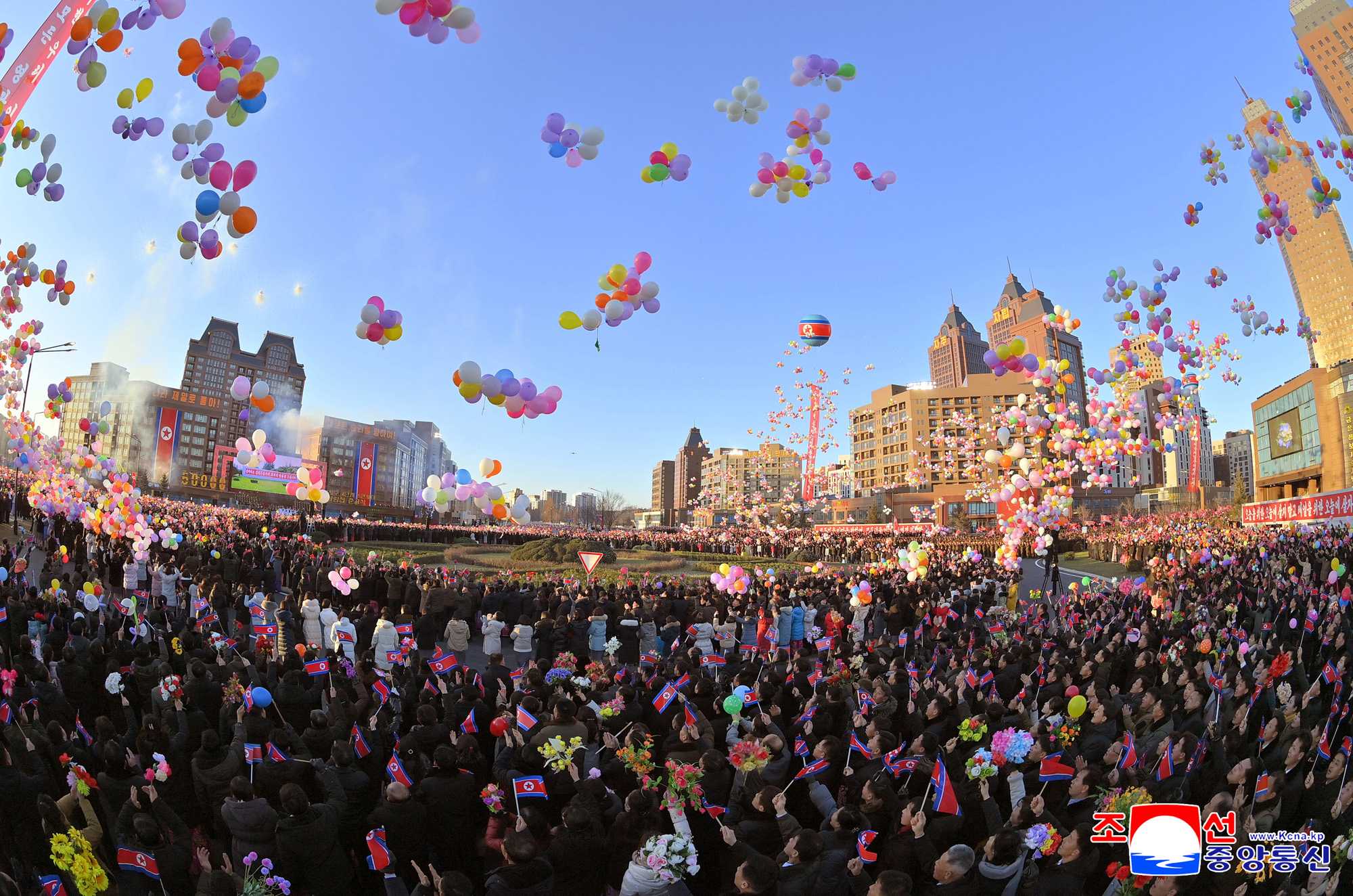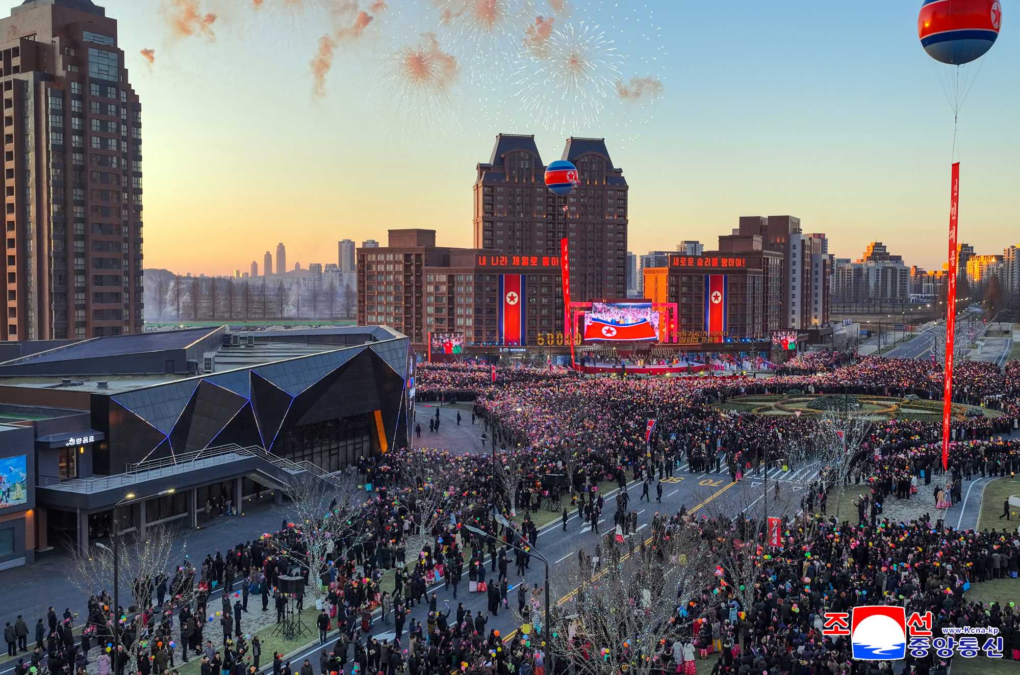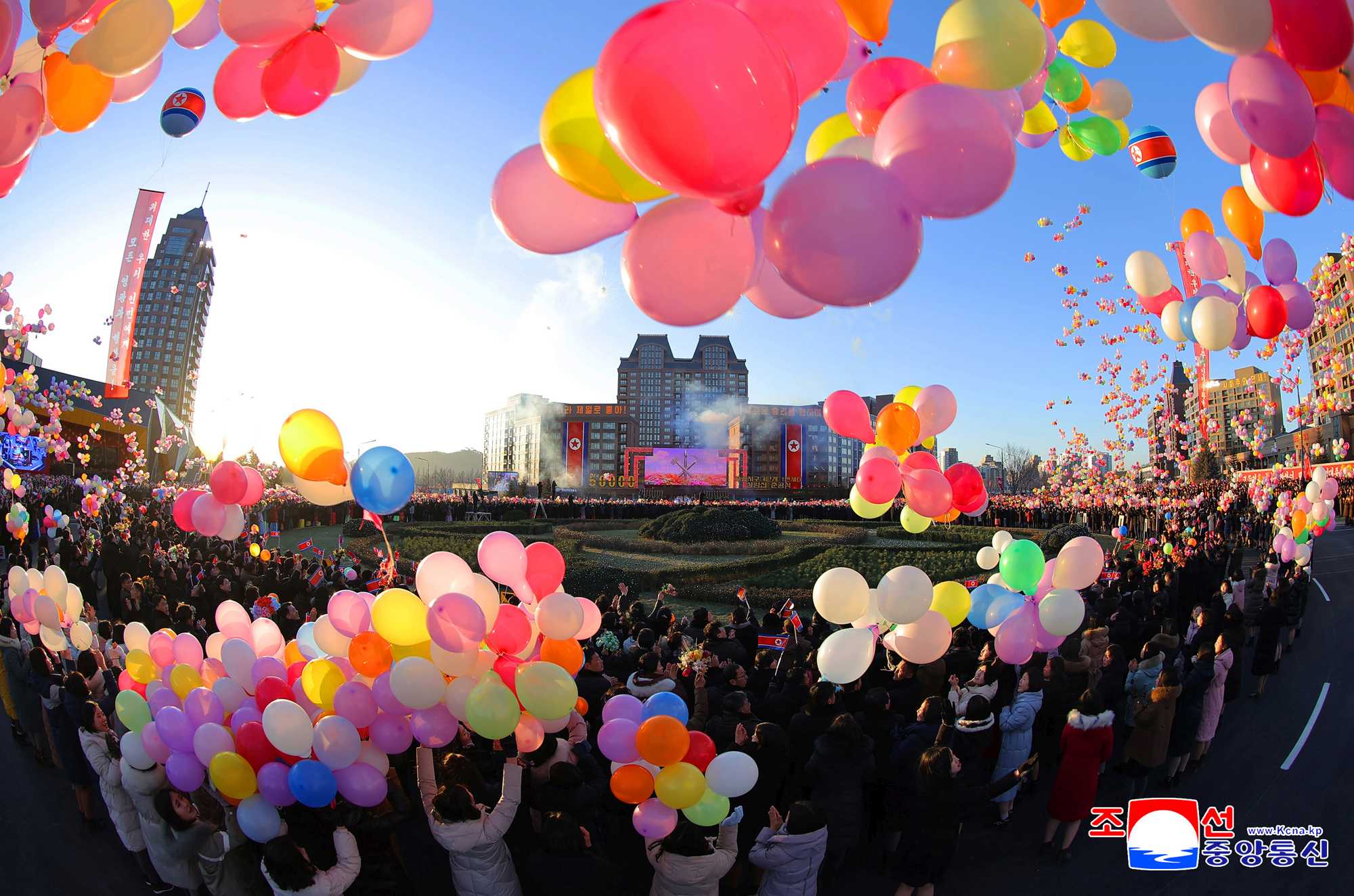 Fireworks were set off, confetti was thrown and balloons were released to the sky above the venue of the ceremony, which was witnessing an auspicious event to be specially recorded in the new golden age of Pyongyang, beautifully decorating the sky of the capital city.
