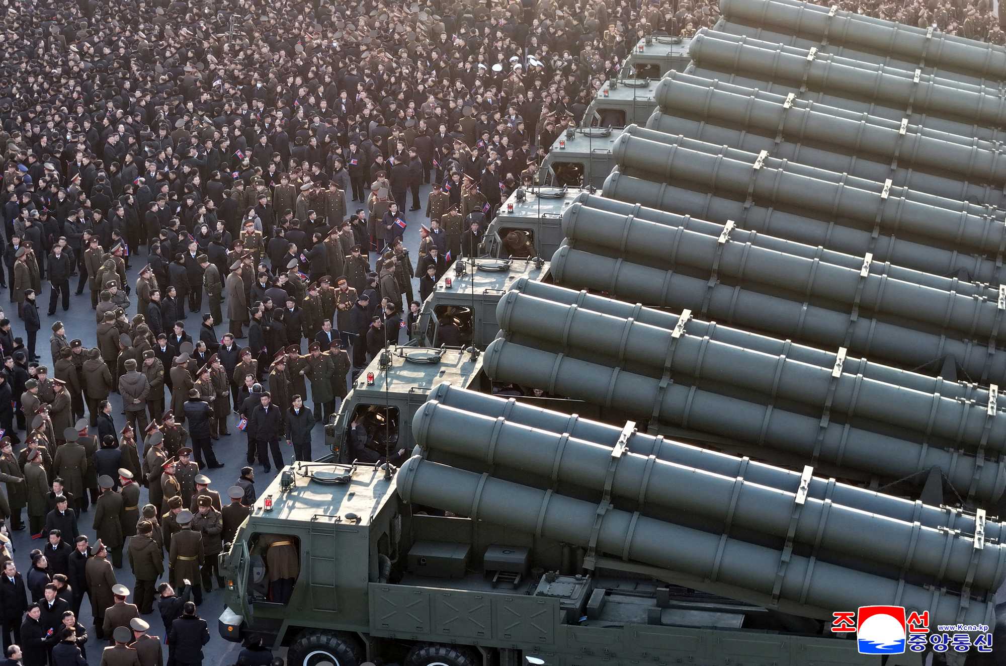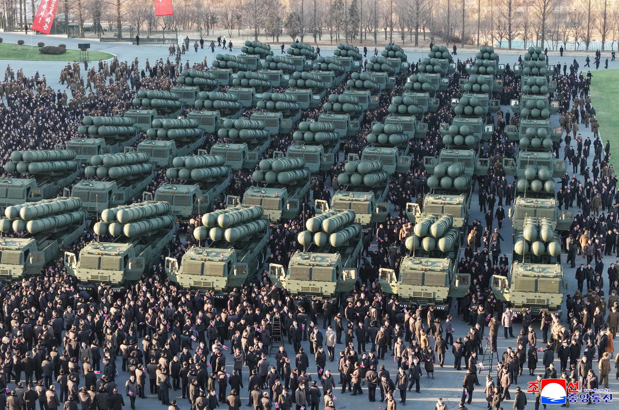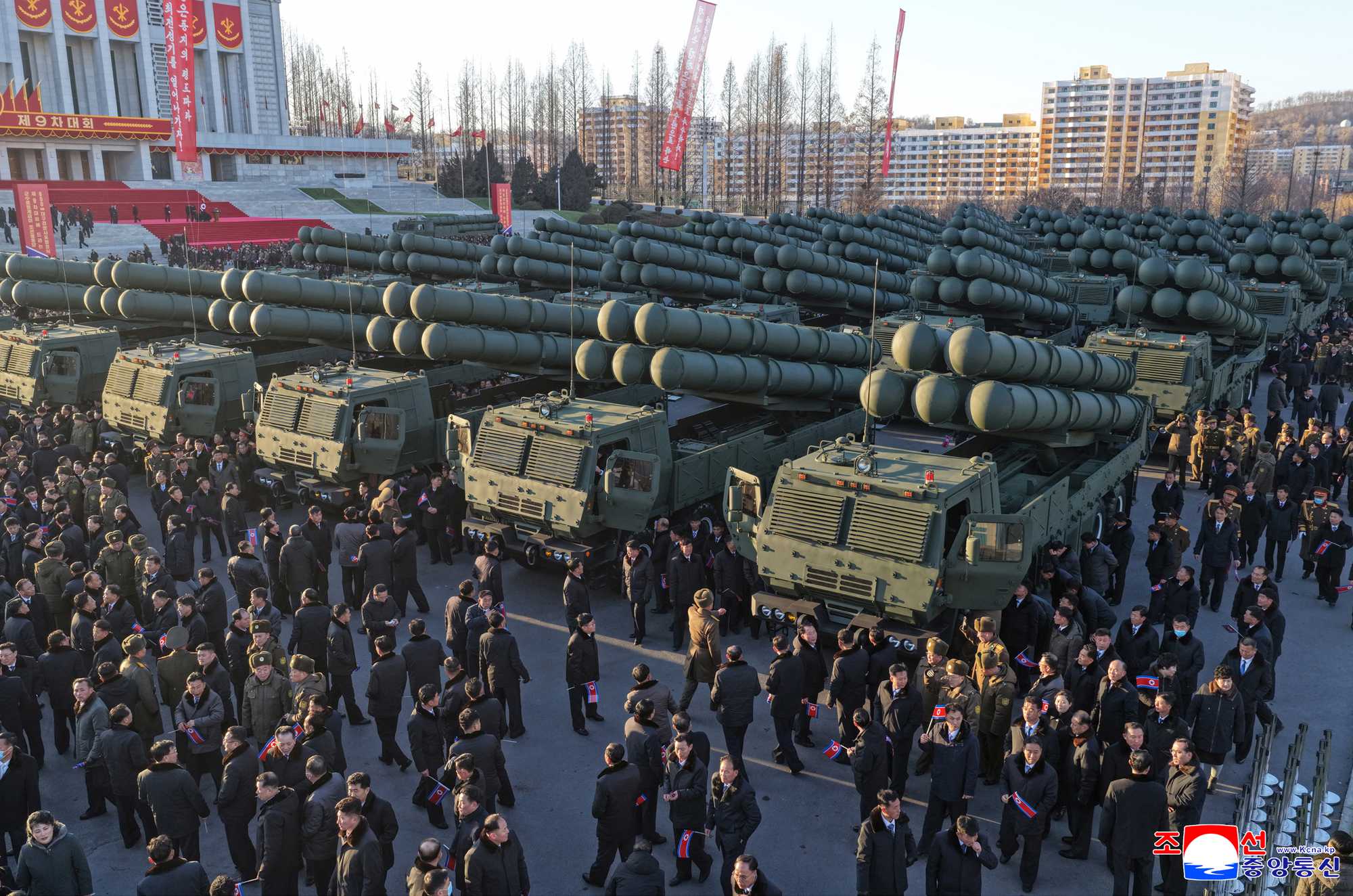 The absolute weapons, fully reflecting the patriotic soul of the soldiers in the national defence sector who had worked with devotion for the accomplishment of the historic mission to consolidate the self-reliant defence capacity to be strongest in the world and symbolic of the definite military superiority of the armed forces of the DPRK, were lined up in fine array at the plaza of the April 25 House of Culture, demonstrating their might.