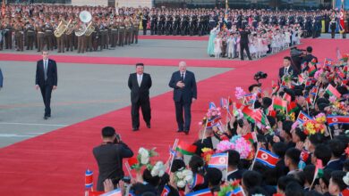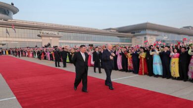 The guard of honour of the Korean People’s Army lined up at the apron of Pyongyang International Airport where the national flags of the two countries fluttered.